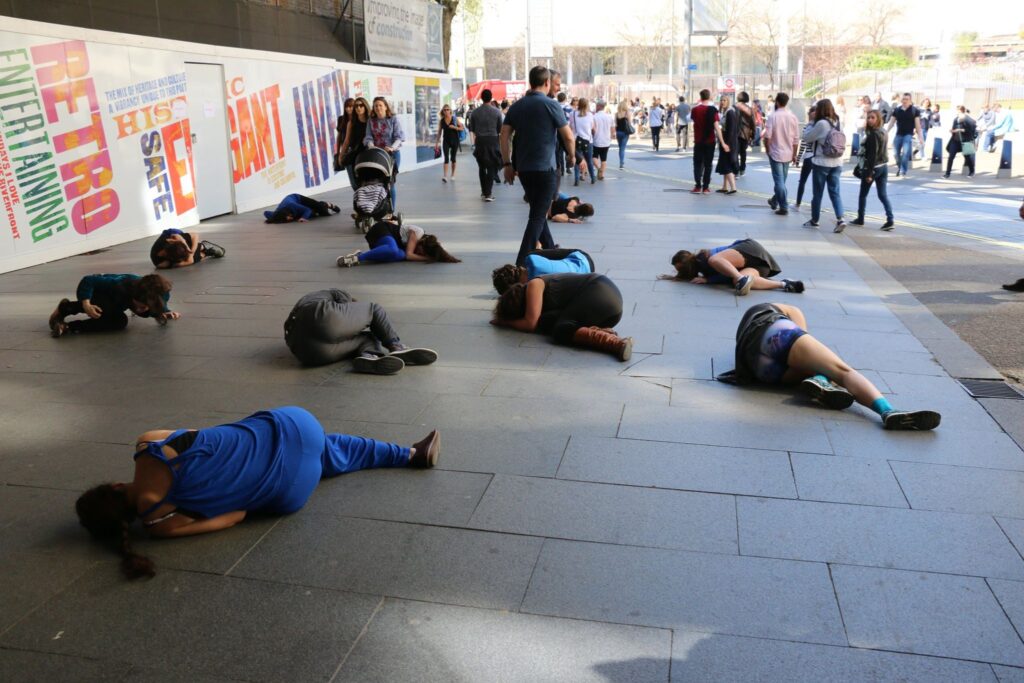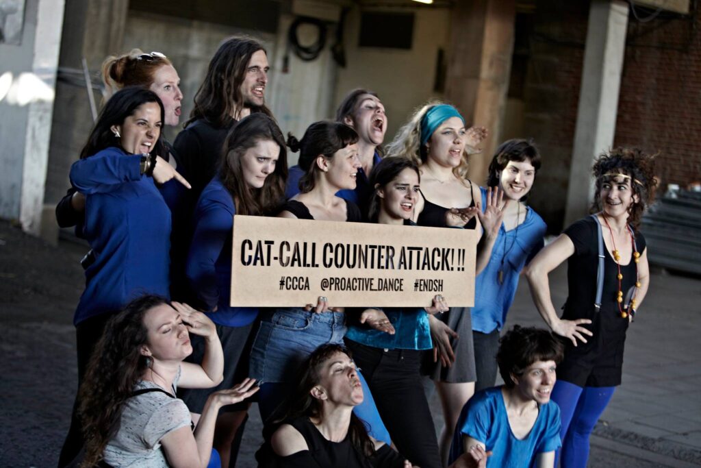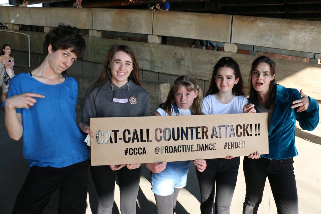 In 2018, with a group of fantastic female identifying women I created Cat Call CounterAttack – a flashmob on London’s Southbank – I held weekly dance theatre workshops focused on exploring different ways to transform story into playfully provocative site responsive performances. Over the course of the workshop, we dove deep and explored different aspects of what it means to be perceived as a female in modern society through experimentation with different theatrical and dance techniques both in the studio and in public spaces. We successfully got people talking about cat calling and the way that women are treated in the street, chatting with audiences of all ages for ages after the performance was finished.